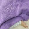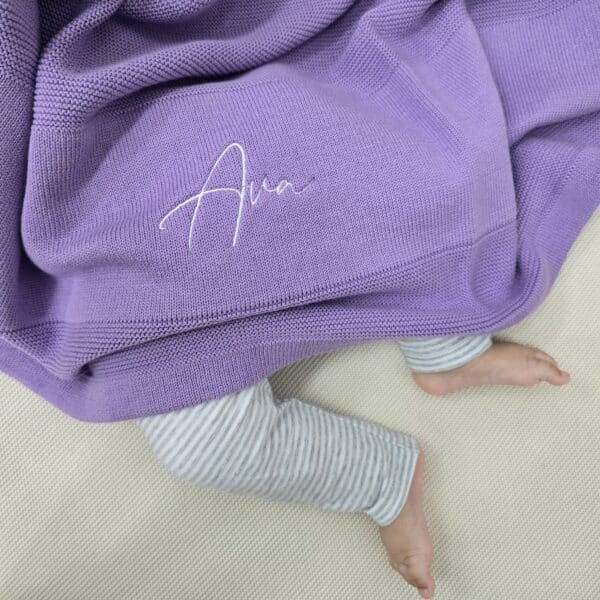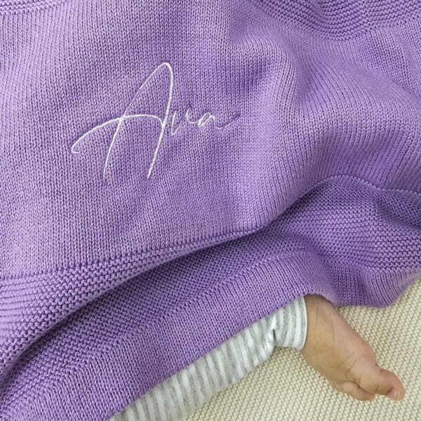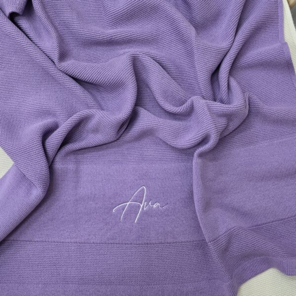 This Purple Single Colour Knitted Blanket comes with your custom name embroidered in either a light purple or white thread.